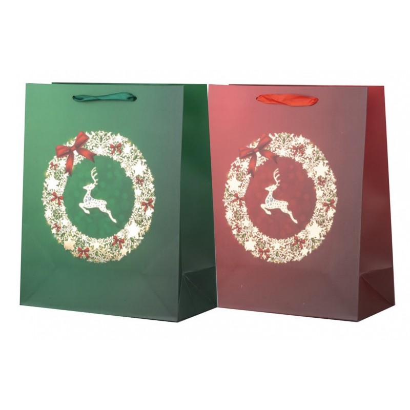 Elegantní vánoční taška s motivem zlatého věnce a jelena. Ideální pro stylové balení vánočních dárků s nádechem luxusu. 2 barevné varianty, dodáváme dle skladové dostupnosti.