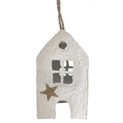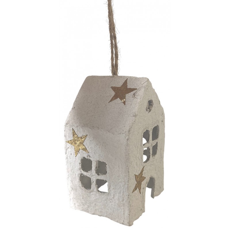 Stylový bílý domeček z papermache, který zaujme svým jemným, nadčasovým designem. Je zdoben zlatými hvězdičkami, což mu dodává luxusní nádech. Skvěle zapadne do každého interiéru. Krásně vynikne v minimalistické váze na větvičce. Je ideální pro vánoční výzdobu.
