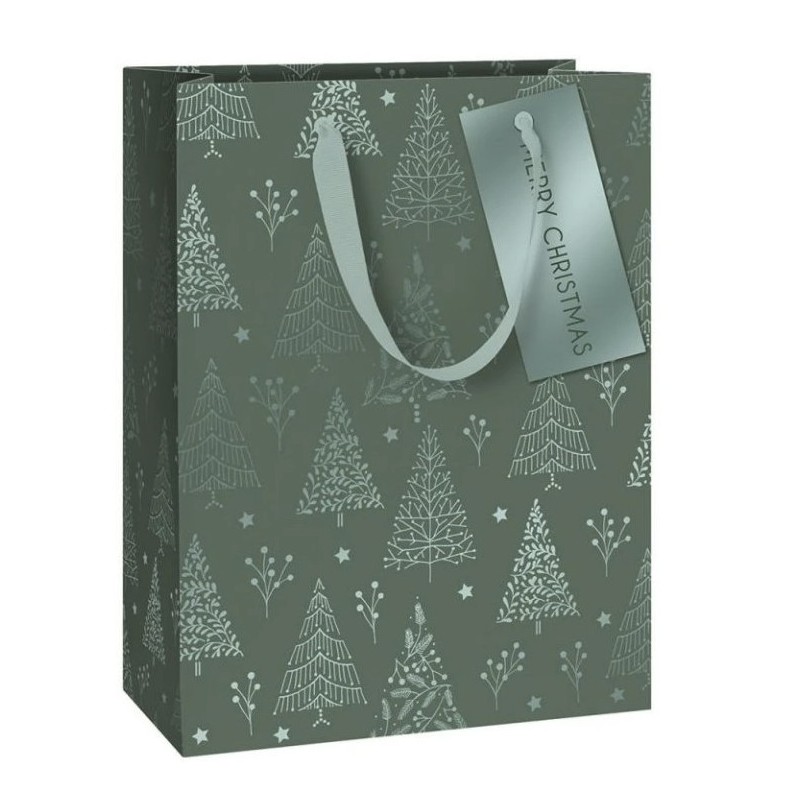 Vánoční dárková taška v zeleném odstínu s motivem jemných stromků. Elegantní a zároveň přírodní design dodá Vašim dárkům sváteční atmosféru. Je ideální pro snadné a stylové balení bez nutnosti papíru a stuh.