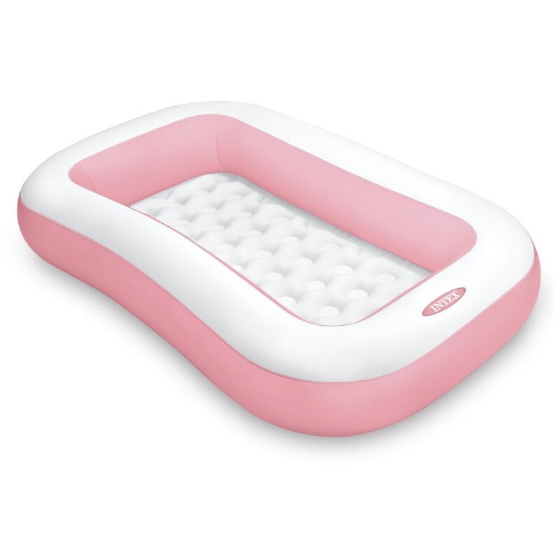 Dětská růžový bazén obdelníkového tvaru je vyroben z testovaného masivního vinylu. Má nafukovací podlážku. Součástí je opravná sada.