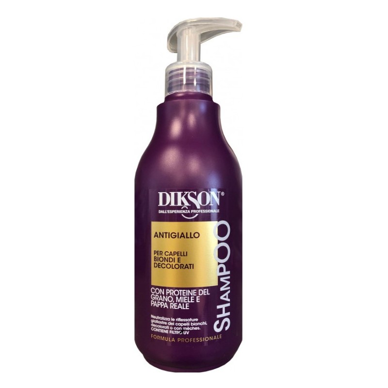 Profesionální šampon Dikson Antigiallo pro blond a odbarvené vlasy neutralizuje nažloutlé odlesky. Obsahuje pšeničné proteiny, med a mateří kašičku, jež vlasy intenzivně vyživují a dodávají jim dostatečnou hydrataci. Výsledkem jsou zdravé a lesklé vlasy. Obsahuje UV filtr.