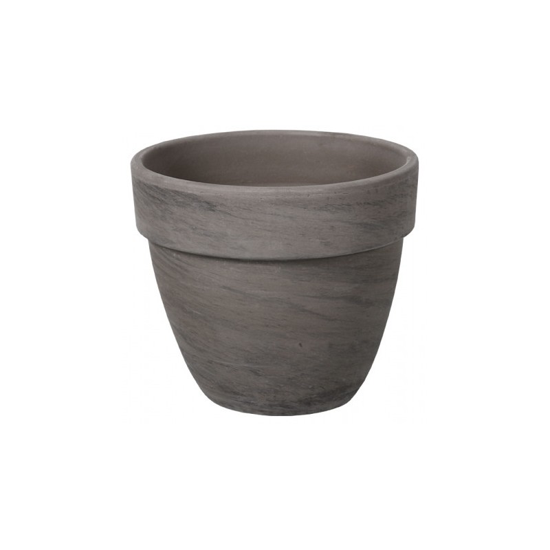 Mrazuvzdorný kónický květináč s horním vyšším okrajem v jedinečném zemitě šedém zbarvení s antracitovým mramorováním. Je melírovaný a každý kus originálně zabarvený v závislosti na složení jílu. Vhodný pro umístění do interiéru i exteriéru, neošetřený, s otvorem.