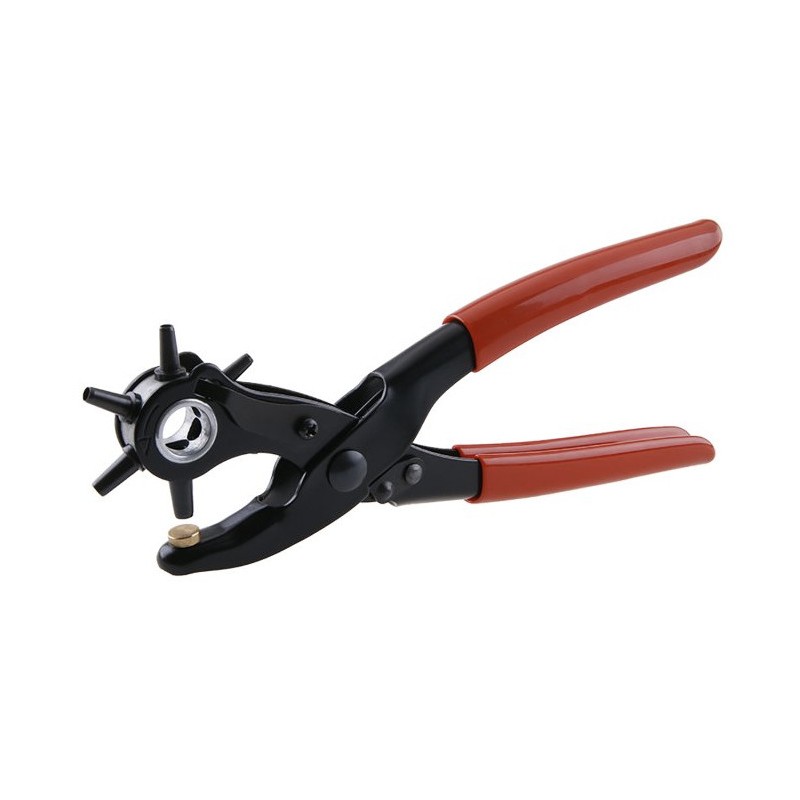 Revolverové děrovací kleště na kůži, textil a plast. Kleště s 6 výměnnými průbojníky v pr.: 2.0, 2.5, 3.0, 3.5, 4.0, 4.5 mm.
