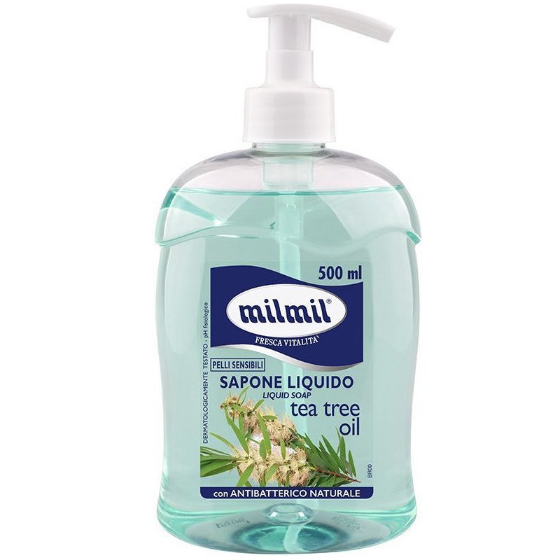 Tekuté mýdlo MilMil s přírodními antibakteriálními složkami z Tea Tree oleje účinně ničí bakterie. Svěží vůně Eucalyptu. Je vhodné i pro citlivou pokožku. Dermatologicky testováno, fyziologické pH.