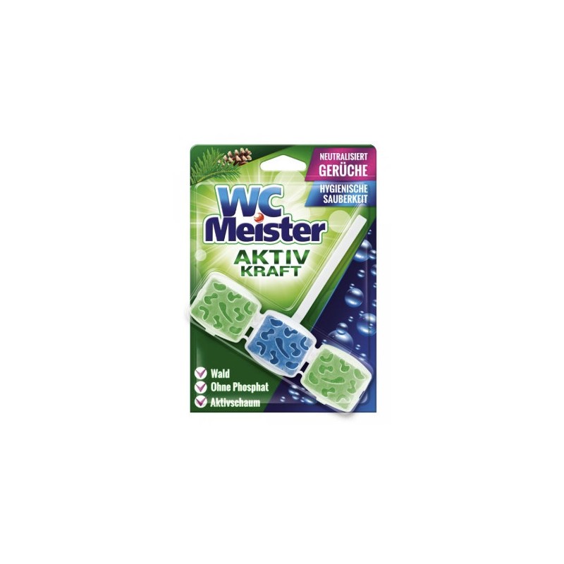 Závěsný blok do WC Meister Aktiv Kraft Pine zanechá Vaši toaletu svěží a hygienicky čistou. Dezinfikuje a zároveň zabraňuje usazování vodního kamene na stěně záchodové mísy. Závěsný blok snadno zavěsíte za okraj mísy a při každém spláchnutí se vytvoří bohatá pěna s čistícími a dezinfekčními částicemi. S příjemnou vůní borovice. Neobsahuje fosfáty.