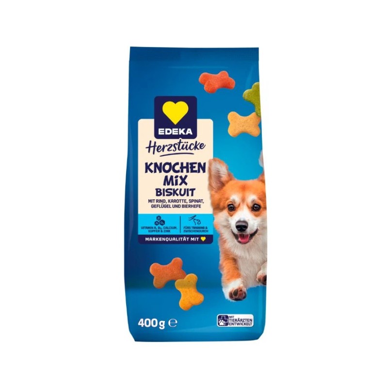Směs kostiček s hovězím masem, mrkví, špenátem, drůbežím masem a pivovarskými kvasnicemi Edeka jsou ideální jako odměna při tréninku nebo jako svačinka mezi jídly pro Vašeho dospělého psa. Pivovarské kvasnice mají příznivý vliv na srst, trávení a vitalitu. Díky přidaným vitaminům A, D3, vápníku, mědi a zinku přispívá ke komplexní podpoře zdraví Vašeho psa od kostí až po imunitní systém. . Podporuje vitalitu a poskytuje energii.