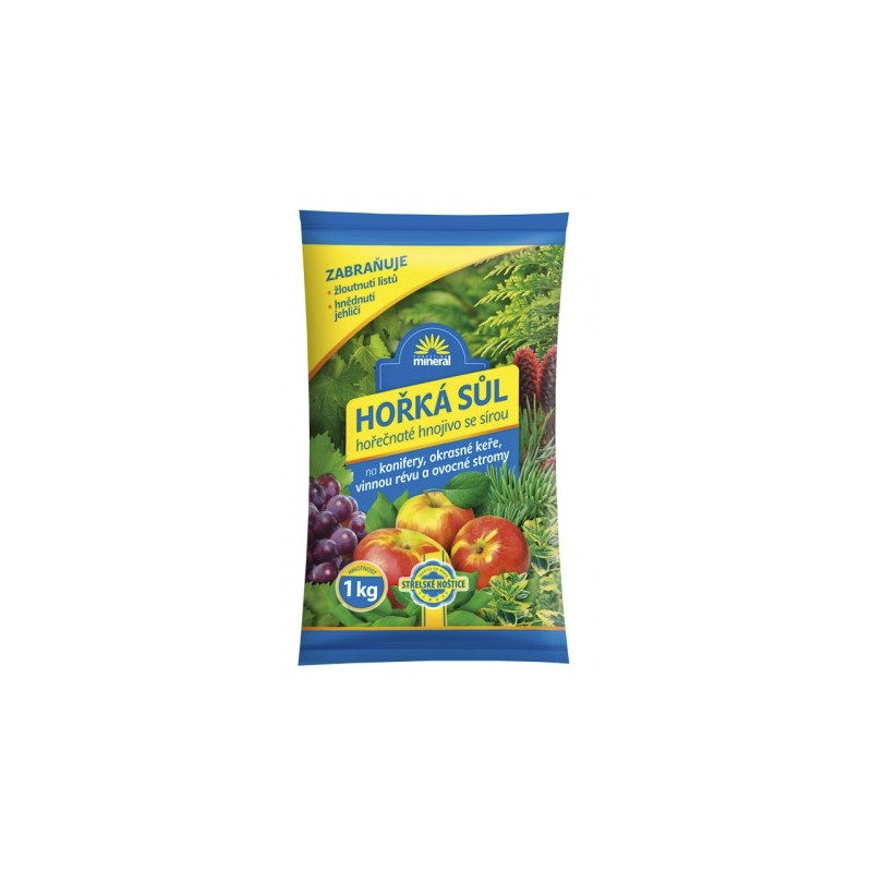 Hořká sůl Mineral je minerální hořečnaté hnojivo určeno k hnojení zeleniny, rychlené zeleniny, ovocných stromů a keřů, chmele, vinné révy a okrasných jehličnanů. Dodává rostlinám potřebný hořčík, jehož nedostatek se projevuje žloutnutím listů či hnědnutím jehličí a sníženou plodností rostlin.