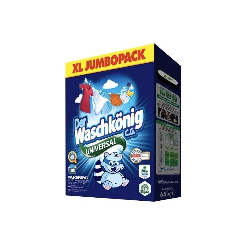 Prací prášek Waschkönig Universal je vhodný na bílé a stálobarevné prádlo. Obsahuje formuli, která odstraňuje nečistoty a skvrny již od 30 °C při zachování barev. Pečuje o barvy tkanin před poškozením a zanechá příjemnou vůni. Obsahuje složky, které chrání Vaši pračku před usazováním vodního kamene a korozí. Složení je na 100 pracích dávek.