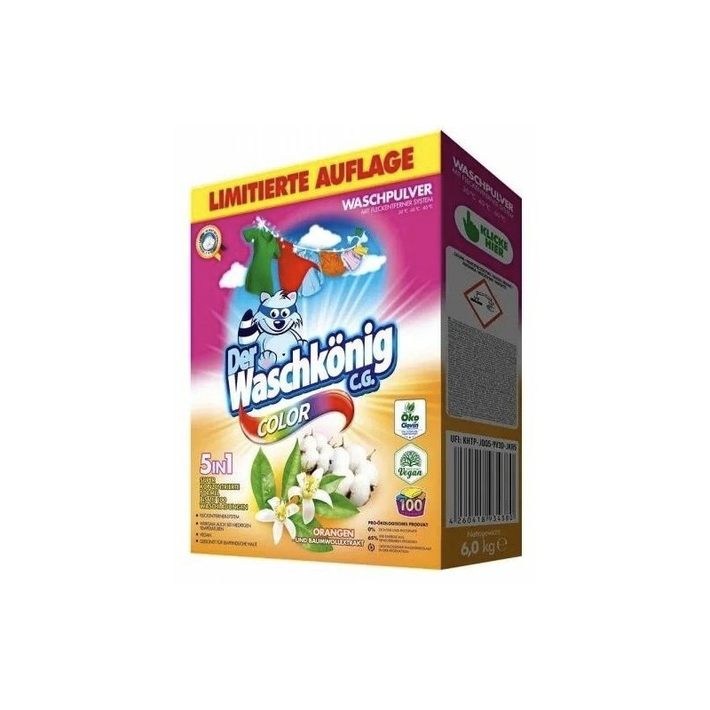 Prací prášek Waschkönig Orangen Color je určen pro praní barevného prádla. Působí přímo na skvrny a je účinný již při nízkých teplotách. Díky svému složení chrání pračku před usazováním vodního kamene. Pečuje o barvy Vašeho prádla zanechá ho provoněné vůní pomeranče. Složení je na 100 pracích dávek.