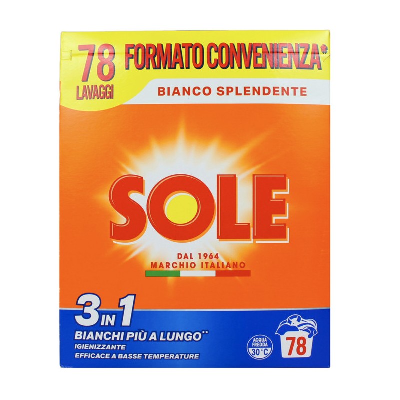 Prací prášek Sole je určen na praní bílého prádla. Složení s bikarbonátem působí proti zažloutnutí a zašednutí prádla. Je účinný již při nízkých teplotách. Odstraňuje i odolné skvrny jako jsou skvrny od trávy, krve atd. Složení je na 78 pracích dávek.