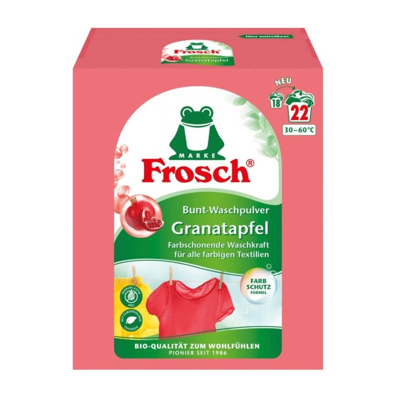 Prací prášek Frosch je určen na praní barevného prádla. Chrání barvu Vašeho oblečení a zároveň ho provoní svěží vůní granátového jablka. Je účinný od 30 °C. Složení je na 22 pracích dávek.