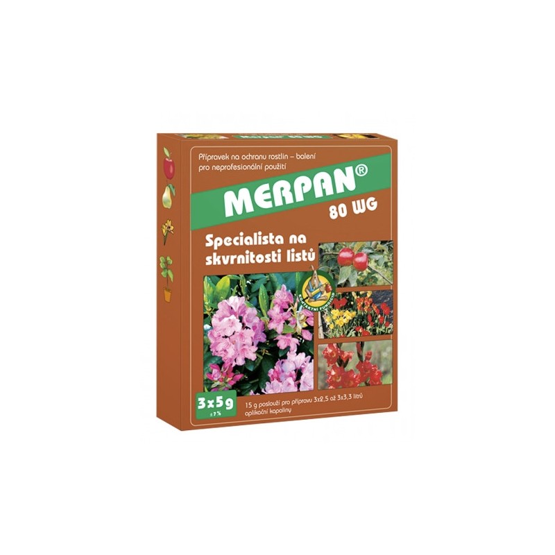 Fungicid Merpan * k ochraně ovocných dřevin, okrasných rostlin, zeleniny a révy proti houbovým chorobám * k moření hlíz a cibulí