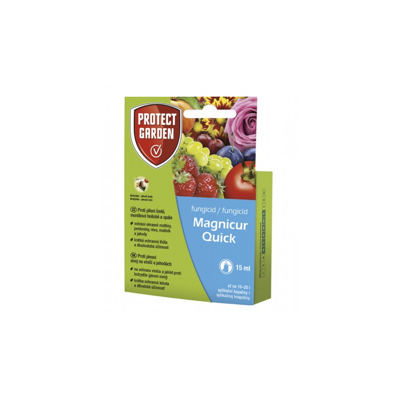 Magnicur Quick je fungicidní přípravek, který je určen k ochraně okrasných rostlin, peckovin, révy, maliníku a jahodníku proti plísni šedé, moniliové hnilobě a spále. Působí kontaktně, má krátkou ochrannou lhůtu a dlouhodobou účinnost. Balení vystačí na přípravu 10 - 20 litrů aplikační kapaliny.