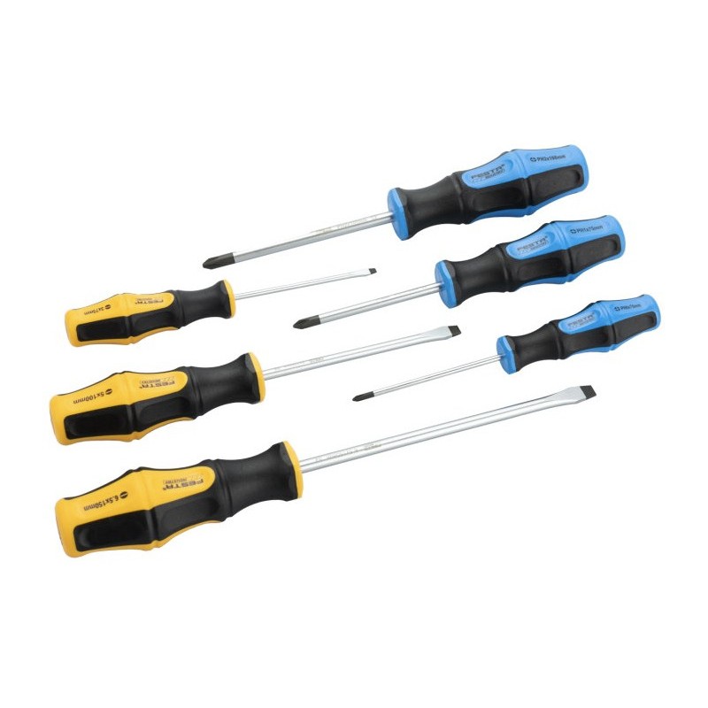 Profesionální sada šroubováků pro průmyslové použití. Dříky jsou vyrobeny z oceli S2 - ocel zušlechtěná legovacími prvky - chrom, křemík, mangan, molybden, vanadium. Magnetická kalená špička. Rukojeti jsou dvoukomponentní - neklouzavý, pohodlný úchop, otvor pro páku.