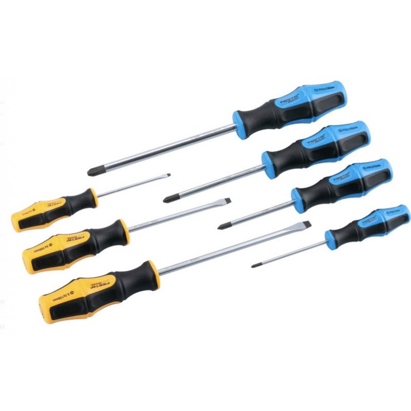 Profesionální sada šroubováků pro průmyslové použití. Dříky jsou vyrobeny z oceli S2 - ocel zušlechtěná legovacími prvky - chrom, křemík, mangan, molybden, vanadium. Magnetická kalená špička. Rukojeti jsou dvoukomponentní - neklouzavý, pohodlný úchop, otvor pro páku.