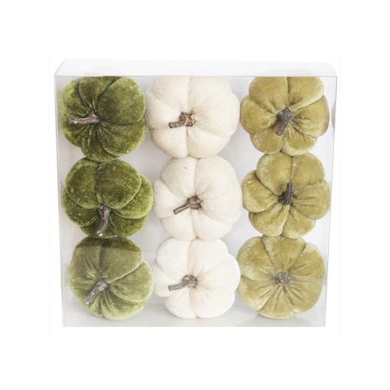 Dekorační textilní dýně v jemných přírodních tónech. Elegantní kombinace světle zelené, tmavě zelné a bílé barvy působí harmonicky a stylově. Jsou ideální pro podzimní aranžmá, výzdobu stolů, oken, věnců. Vneste do svého domova útulnou sezónní atmosféru s těmito originálními doplňky. Balení obsahuje 9 ks.