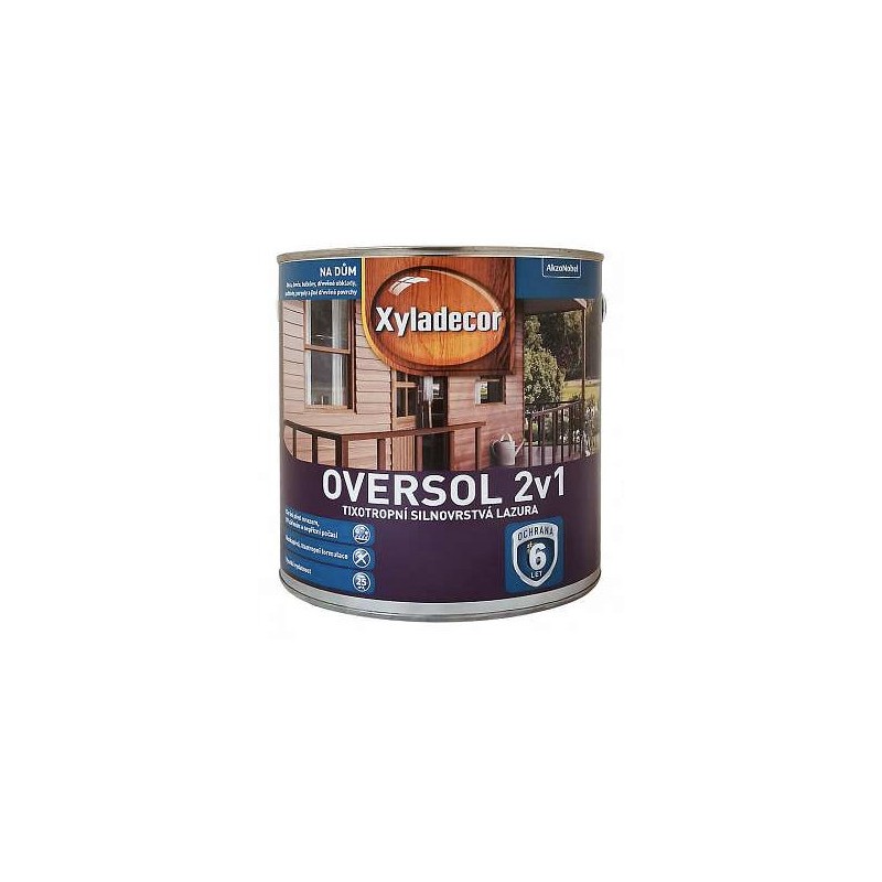 Unikátní tixotropní lazura Oversol 2v1 je určena na dřevěné povrchy v exteriéru jako jsou okna, dveře, balkóny, dřevěné obklady, podhledy apod. Díky tixotropní, neboli rosolovité konzistenci, lazura nestéká. Nesmí se míchat - znehodnotíte tixotropní konzistenci. Povrch po natření získá silný, elegantně polomatný film. Silnovrstvá lazura dlouhodobě chrání ošetřené povrchy před povětrnostními vlivy, UV zářením a mrazem Dlouhodobá ochrana ošetřeného povrchu je až 6 let.