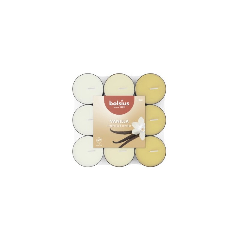 Tříbarevné čajové svíčky s vůní vanilky. Balení obsahuje 18 ks.