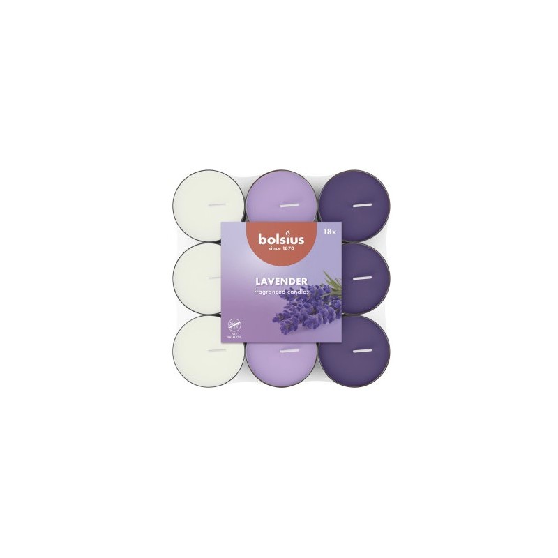 Tříbarevné čajové svíčky s vůní levandule. Balení obsahuje 18 ks.