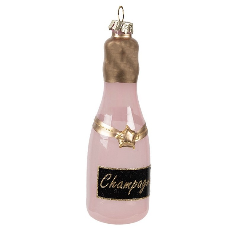 Stylová skleněná vánoční ozdoba ve tvaru růžové láhve šampaňského.