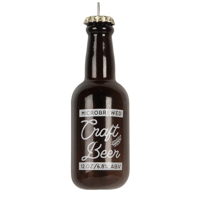 Stylová skleněná vánoční ozdoba ve tvaru hnědé láhve piva.
