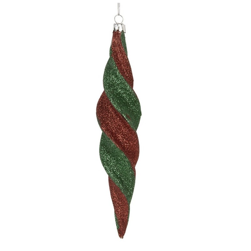 Krásně zpracovaná skleněná ozdoba ve tvaru rampouchu v červeno-zeleném odstínu zdobená jemnými třpytkami. Tradiční sváteční motiv, který vnese do interiéru hravou eleganci a slavnostní atmosféru.