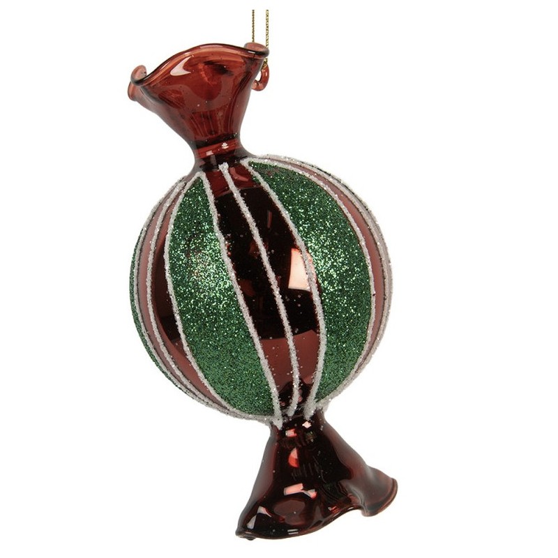Krásně zpracovaná skleněná ozdoba ve tvaru bonbonu v červeno-zeleném odstínu zdobená jemnými třpytkami.