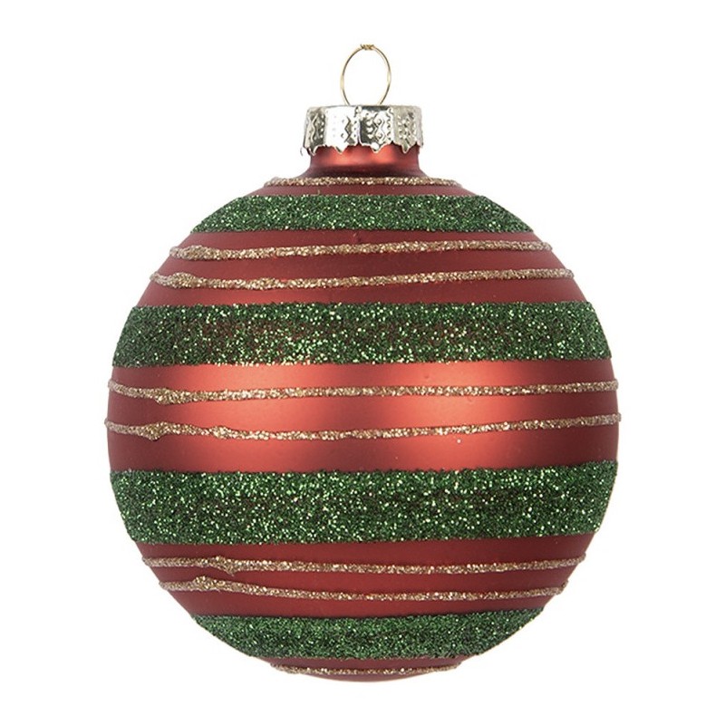 Skleněná ozdoba s červeno-zeleným vzorem, zdobená jemnými zlatými třpytkami.