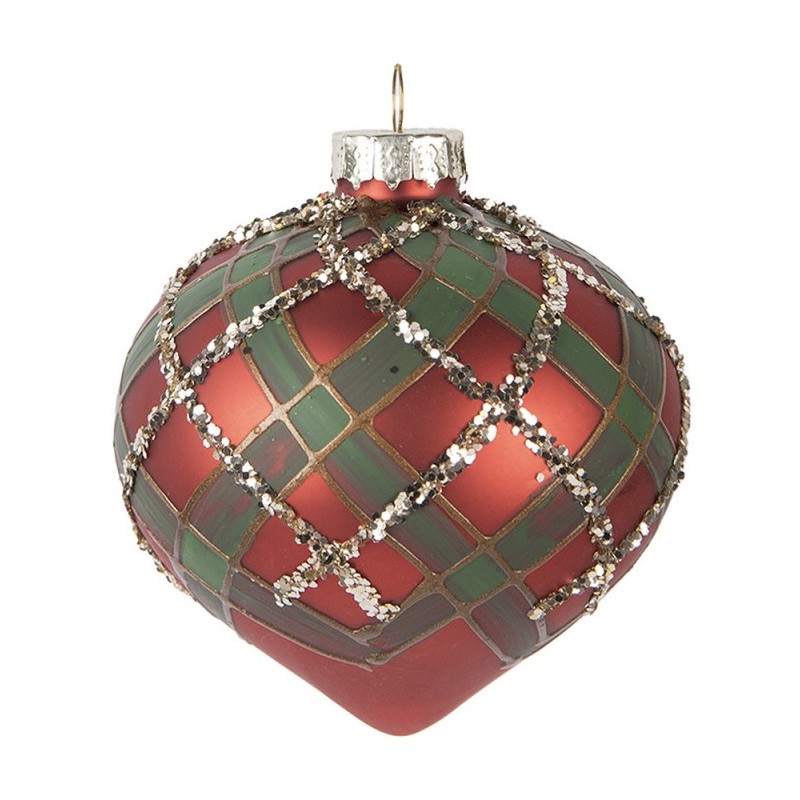 Skleněná ozdoba s červeno-zeleným vzorem, zdobená jemnými stříbrnými třpytkami.