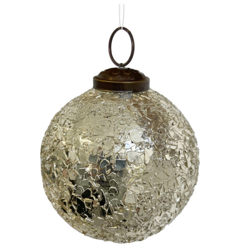Vánoční skleněná ozdoba se stříbrným dekorem.