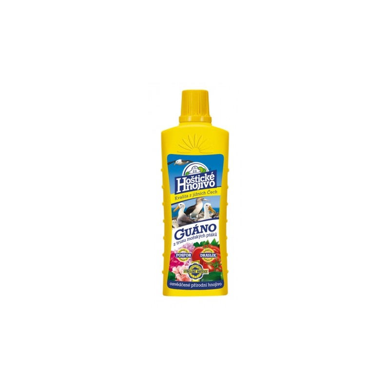 Hoštické guáno v kapalné formě obsahuje přírodní guáno, pocházející z trusu mořských ptáků z pobřeží jižní Ameriky. Rostlinám dodává potřebné živiny v průběhu celého vegetačního období. Hnojivý roztok pro zálivku připravíte smícháním 15 ml hnojiva (po okraj naplněný uzávěr) s 3 litry vody. Rostliny se hnojí zalitím na substrát 1x týdně v době vegetace (březen - říjen). Před použitím obsah láhve důkladně protřepejte.