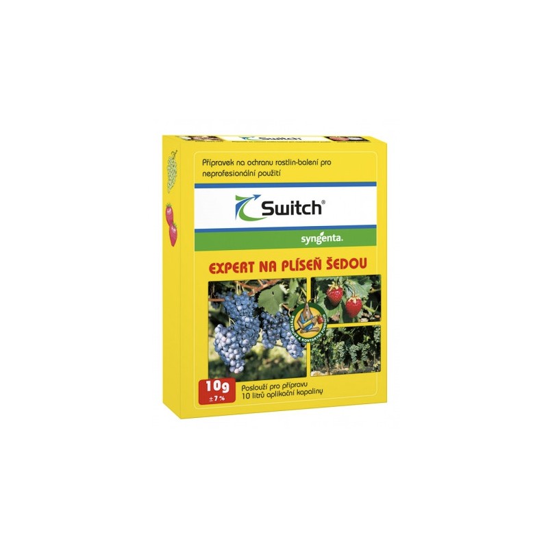 Fungicid Switch je přípravek ve formě ve vodě rozpustného granulátu s kontaktním a systémovým účinkem. Je určen k ochraně vinné révy a jahodníku. Expert na plíseň šedou. Hrozny chrání zvenku i zevnitř. Má kontaktní i systémový účinek. Déšť 2 hodiny po aplikaci neovlivňuje účinnost.